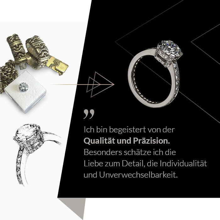 Ein Brillant von zwei Karat. Ein Geschenk ihrer Mutter zur bestandenen Doktorarbeit. Viele Jahre lag er unbeachtet in einer Schatulle, obwohl seine Besitzerin eine leidenschaftliche Schmuckliebhaberin ist. Es fehlte nur eine Idee. Bis sie eines Tages meine Werkstatt betrat.