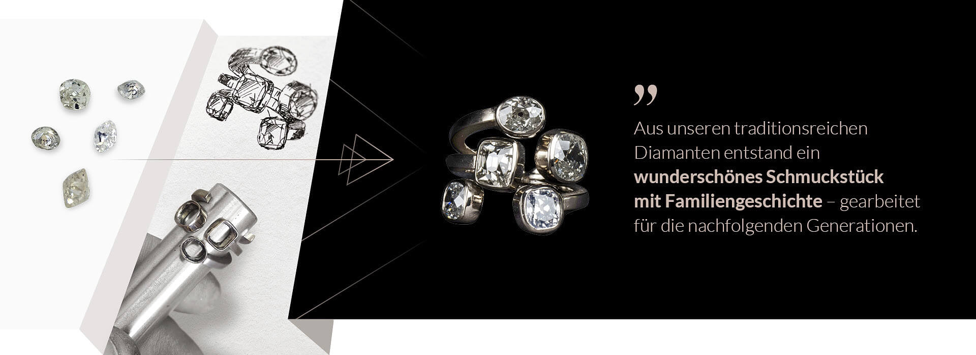 Für dieses neue Schmuckstück wurden die Diamanten behutsam aus ihren historischen Fassungen gelöst, fachgerecht ausgefasst und sorgfältig gereinigt. So konnten sie ihren ursprünglichen antiken Schliff und ihr charakteristisches Feuer wieder vollständig entfalten. In einer zeitgemäßen Neuinterpretation verbinden sie Vergangenheit und Gegenwart auf harmonische Weise.