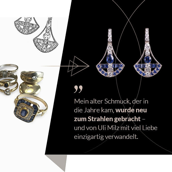 Eine Vorarlbergerin aus Feldkirch überreichte mir Schmuckstücke, die ihrem Stil und ihrem Charakter nicht mehr entsprachen. Wie so viele Schmuckstücke, die man einst geschenkt bekam oder geerbt hat, lagen auch diese nur noch im Safe. Wir lernten uns auf einer Messe kennen, und ich erzählte ihr von meiner Begeisterung, den Wert alter Schmuckstücke zu erkennen und sie in etwas noch Wertvolleres zu verwandeln. Ich berichtete ihr von meinem Konzept, Werte wertvoll zu transformieren. Sie war auf Anhieb begeistert und erzählte mir von ihrem Schmuck.
