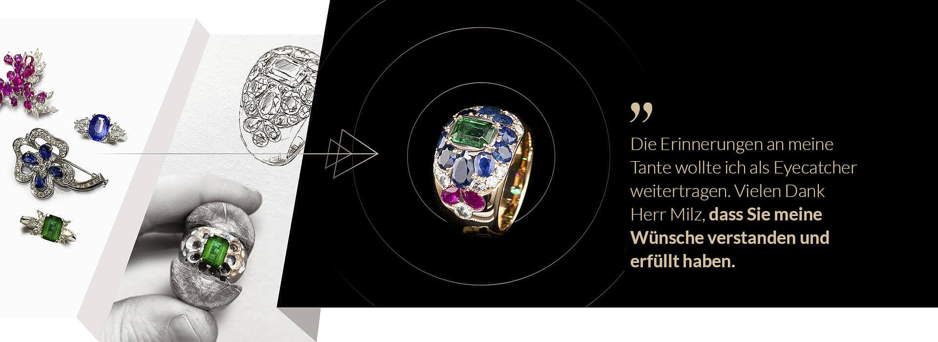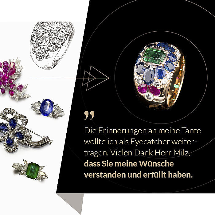 Ich fertigte Skizzen an, verwarf, veränderte, baute Modelle. Schritt für Schritt entstand das richtige Gefühl. Der richtige Ausdruck. Der sattgrüne Smaragd fand seinen Platz im Zentrum. Umspielt von den farbigen Edelsteinen, die ihn wie in einer leisen Choreografie begleiten. Fast wie eine Szene auf einer Opernbühne. Leicht im Spiel und zugleich kraftvoll in der Wirkung. Ein klares Statement.