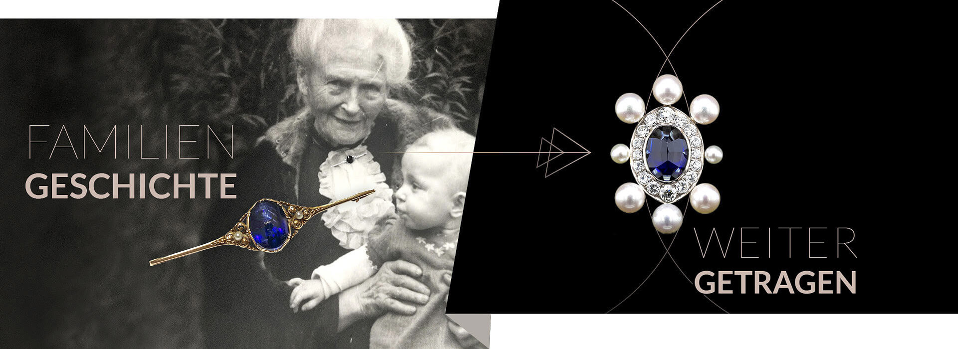 Zu meiner großen Freude erhielt ich von meiner Kundin zusätzlich ein historisches Foto: Darauf trägt die Großmutter ihre geliebte Brosche am Kragen der Bluse. Auf ihrem Schoß sitzt, noch als Kleinkind, meine heutige, inzwischen 70-jährige Kundin. Dieses Bild war ein berührendes Zeitzeugnis und machte auf eindrucksvolle Weise sichtbar, welchen emotionalen Wert überlieferter Familienschmuck besitzt.