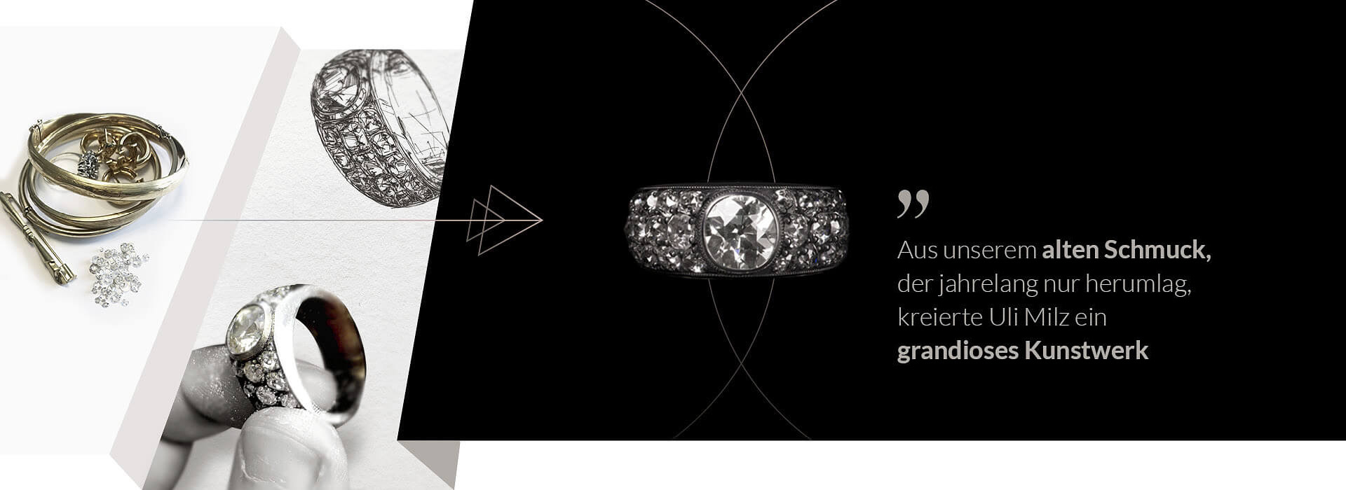 Kontraste bildeten den Grundstock dieses ausdrucksstarken Pavérings. Meine Kundin erhielt antike Schmuckstücke von ihrer Schwiegermutter. Sie waren mit Altschliffdiamanten besetzt und in Broschen und Ringen gefasst. Diese historischen Diamanten besitzen weniger, unregelmäßig geschliffene Facetten als moderne Schliffe wie der Brillantschliff. Jeder einzelne Stein trägt Charakter und wirkt eigenständig für sich.