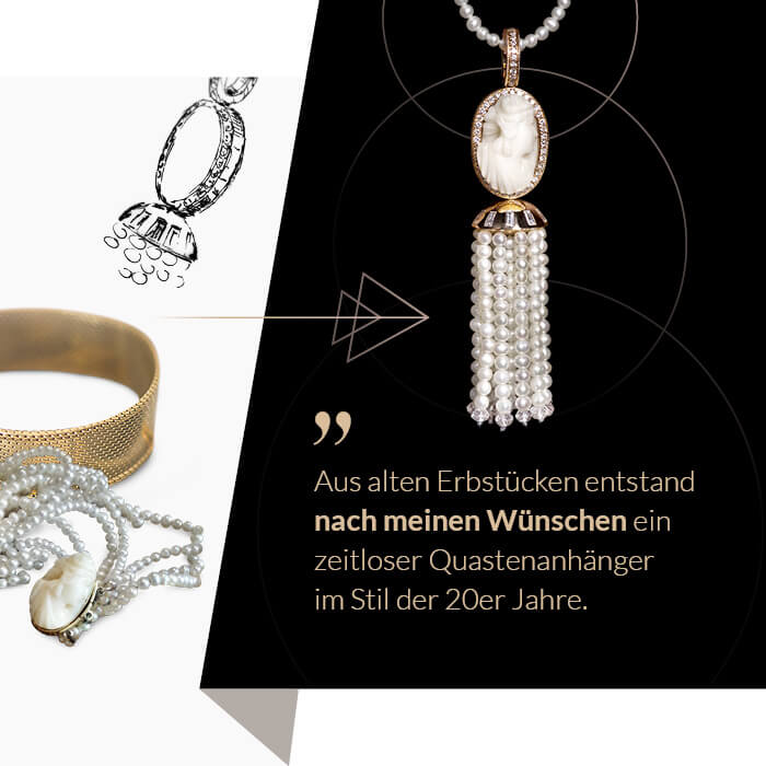 Aus einem dieser Schmuckstücke stammt eine außergewöhnliche Kamee: die Darstellung eines Gelehrten mit Turban und Robe. Sie bildet das Zentrum dieses einzigartigen Anhängers. Umrahmt wird die Kamee von fein funkelnden Diamanten, die ebenfalls aus den ursprünglichen historischen Schmuckstücken stammen und dem neuen Design ihre authentische Tiefe verleihen.