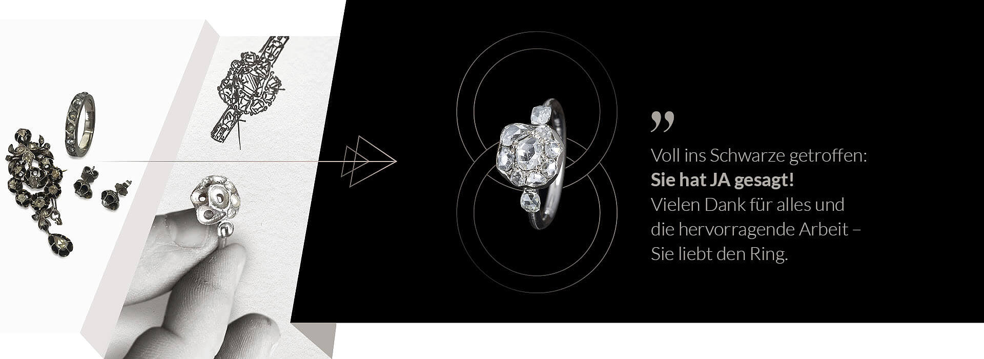 Diese Transformation beschreibt, was ich unter Altschmuck Alchemie verstehe. Sie greift gemeinsame Erlebnisse, Erinnerungen und Gefühle auf und verwandelt sie in ein Schmuckstück, das nicht nur schön am Finger wirkt, sondern eine innere Geschichte trägt.