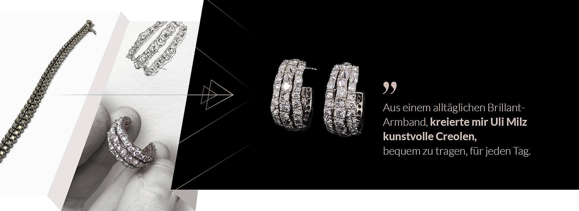 Ich löste die Edelsteine aus ihren Fassungen reinigte sie sorgfältig und begann zu entwerfen. Von Anfang an war klar dass dieses Schmuckstück statische Präzision braucht und zugleich eine freie skulpturale Bewegung. Nach und nach formte sich die Idee einer dreigeteilten Kreole in der die Brillanten nicht gleichmäßig sondern in wechselnden Größen angeordnet sind. Dadurch entstand eine weiche fließende Bewegung fast wie eine schwebende Linie.
