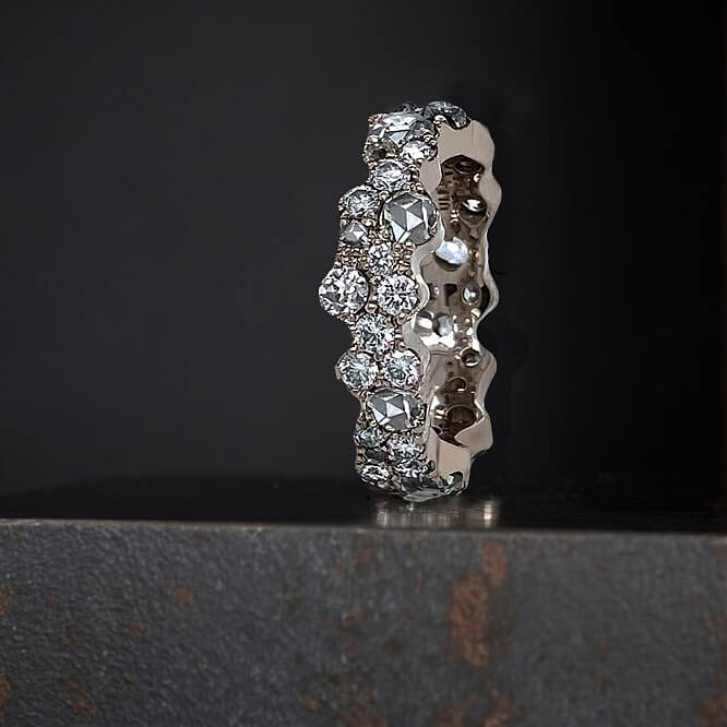 Wie lässt sich Zeit in ein Schmuckstück fassen? Vielleicht, indem man das Funkeln vergangener Epochen mit der Leuchtkraft der Gegenwart vereint. Ich habe sie zusammengeführt auf einem umlaufenden Band aus Palladium-Weißgold, das ihre unterschiedlichen Stimmen in Einklang bringt.