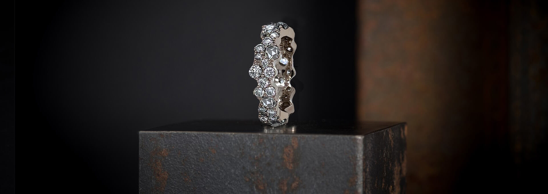 Wie lässt sich Zeit in ein Schmuckstück fassen? Vielleicht, indem man das Funkeln vergangener Epochen mit der Leuchtkraft der Gegenwart vereint. Ich habe sie zusammengeführt auf einem umlaufenden Band aus Palladium-Weißgold, das ihre unterschiedlichen Stimmen in Einklang bringt.